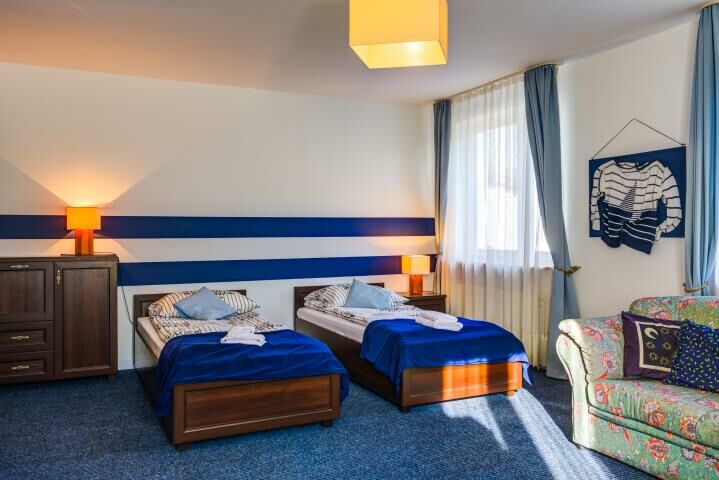 Część pensjonatowa oferująca zakwaterowanie dla 35 gości 12 pokoi i apartamentów z prywatnymi łazienkami oraz tarasami z malowniczym widokiem.